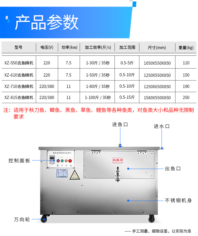| 型号 | XZ-550去鱼鳞机 | XZ-610去鱼鳞机 | XZ-710去鱼鳞机 | XZ-815去鱼鳞机 |